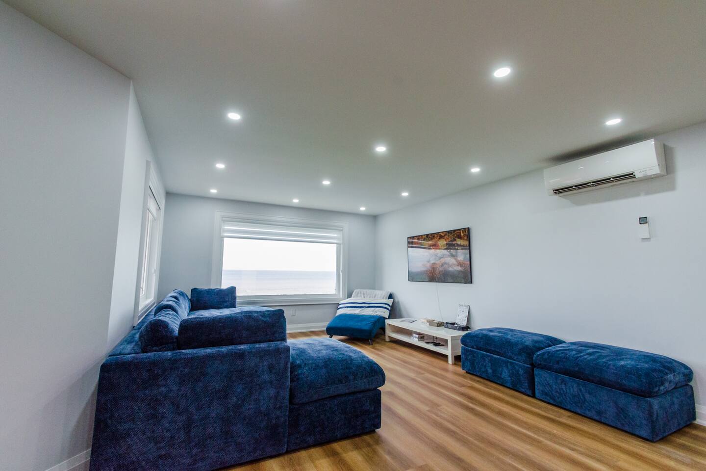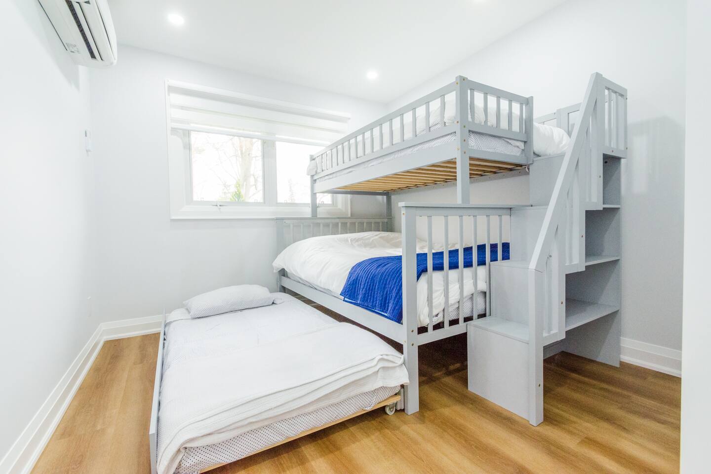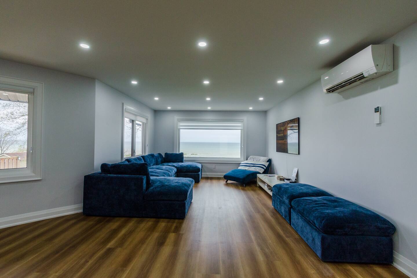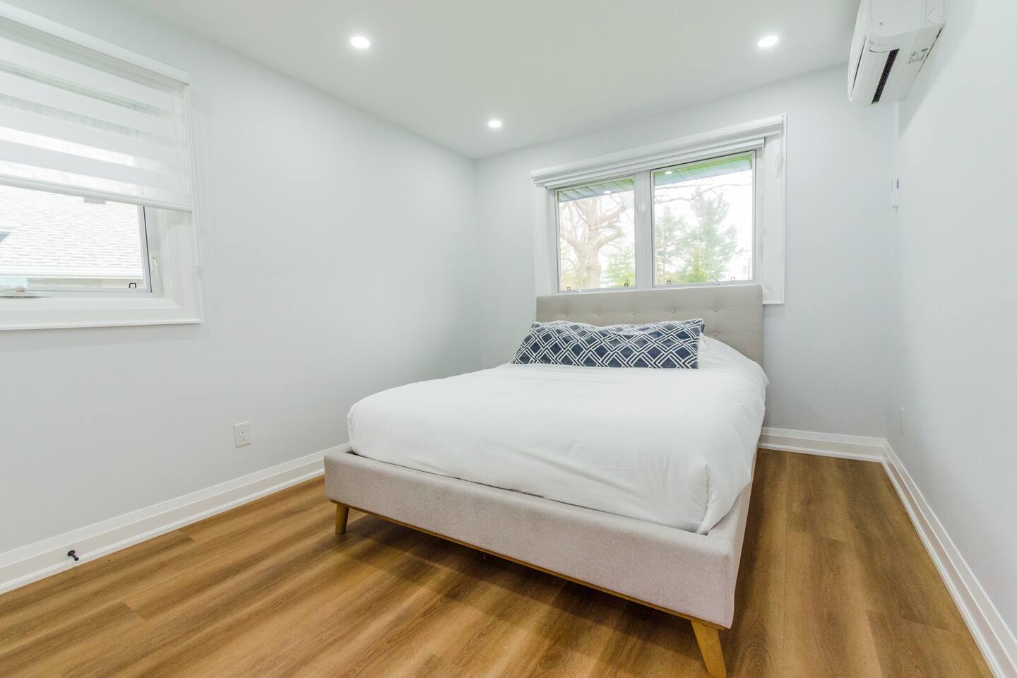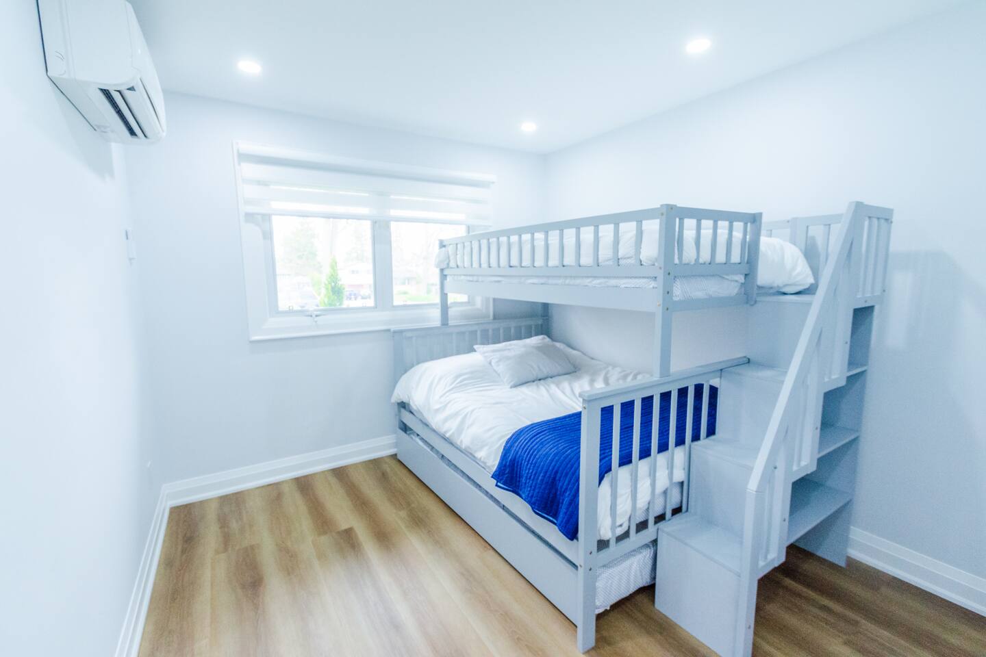 This exquisite Five bedrooms (8 beds), Three Full Bathrooms, a powder room Lake house offers unparalleled luxury and comfort. Boasting private & direct access to the beach and a serene private swimming pool. Enjoy this spacious & beautiful newly renovated, appointed interiors, designed for both relaxation & entertaining. The fully equipped kitchen is chef's delight, featuring modern appliances & ample counter & storage space, perfect for preparing gourmet meals or casual snacks. With Five bedrooms, this house provides ample space and privacy for large families or groups. Main Floor Description: Three bedrooms -Bedroom 1: King Size Bed, Bedroom 2: 1 Queen Bed, Bedroom 3: Bunk bed - 1 double, 1 Twin Bed on top and 1 Twin bed roll out. One Full Bathroom & a Powder room. Laundry Room, Living room with TV & Kitchen & dining, access to the backyard via deck. Walkout Basement Description: Two Bedrooms - Bedroom 4: 1 Queen bed and Bedroom 5: 1 Queen & 1 Double Bed. Two Full Bathrooms, dedicated workstation. Living Room 2 with TV, walkout to the pool area, Children's playroom with TV & a Single Mattress. Extra Queen Mattress provided upon request. Outside, the expansive grounds invite you to embrace waterfront living. Enjoy direct, private access to the lake ideal for picnic, sunbathing, swimming. Cool off in the refreshing private swimming pool, or simply relax on the spacious deck, taking in the breathtaking views while grilling food or enjoying marshmallows around the fire pit. This house is a perfect setting for making memories and enjoying the luxury. Pls note the pool is maintained and cleaned on a weekly basis. The water quality is tested too. The mature trees around the house and the winds can cause dead leaves and debris to accumulate in few hours on the pool which is beyond our control. We appreciate your understanding and help with using skimmer net to remove the natural debris as needed. You can park ONLY 4 to 5 cars. Please note we do have one spot of car parking available in the garage with Tesla Charger (not EV Charger) The house is located in a beautiful town of Port Colborne. So much to explore and enjoy. Be ready you’ll be On Lake Time once you arrive this beautiful town ☺️